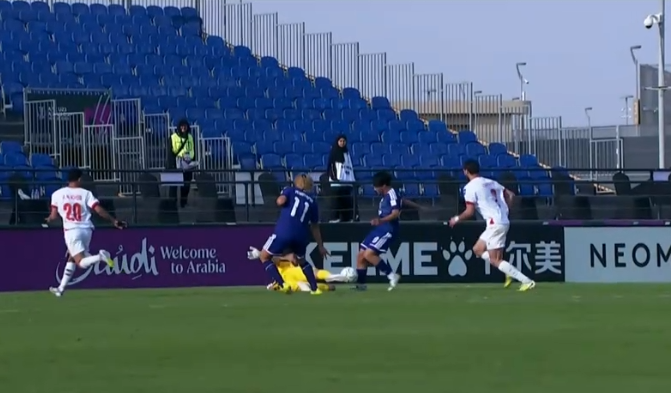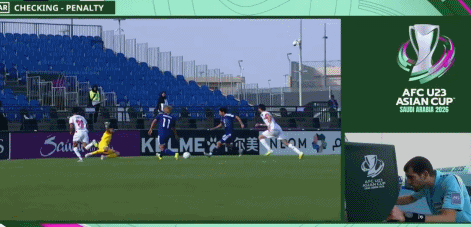 在2026年U23亚洲杯八强战里,日本对阵阿联酋。在古⾕柊介禁区内被绊倒之后,主裁判回看慢镜头之后取消点球。